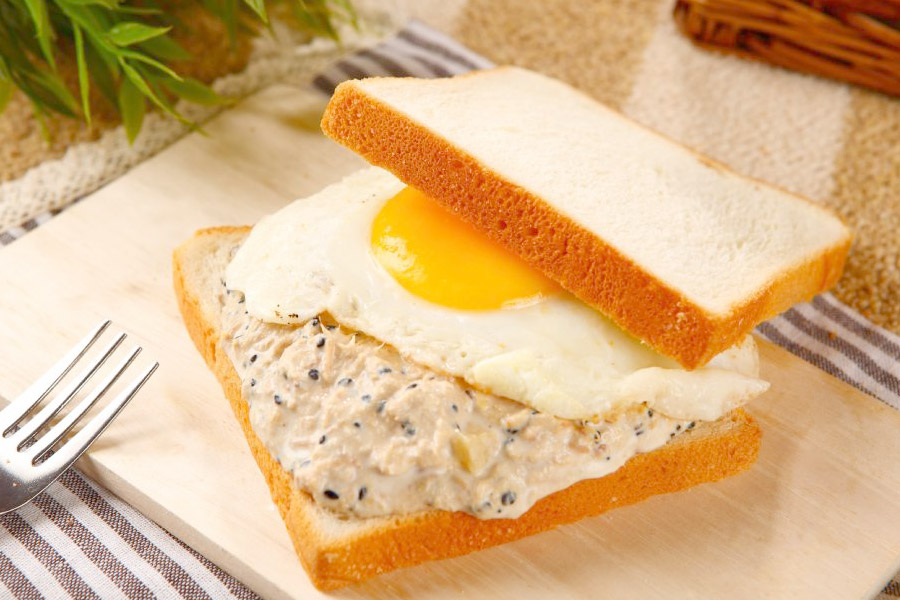 ▲塗上一層滿滿的鮪魚特調沙拉,配上一顆優質雞蛋,夾入Q彈的嚴選吐司,獨特的鮪魚蛋吐司,也是我們的人氣產品之一喔。