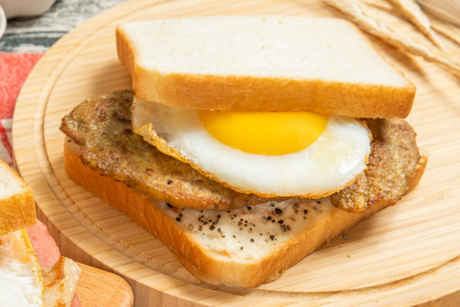 ▲獨特祕方醃製的咖哩口味里肌肉排,彈牙有嚼勁,搭配一顆優質雞蛋,夾入Q彈口感的晨光吐司,美味又順口。