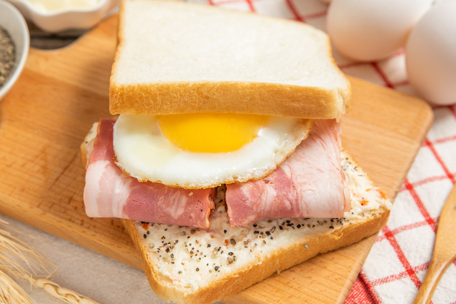 ▲煎到焦香味十足培根,放入特調薯泥沙拉裡搭配一顆優質雞蛋,夾入QQ彈的晨光吐司,每口紮實的口感,讓人一再回味。